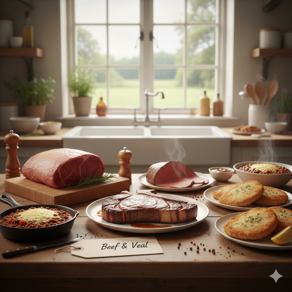 Beef is the name given to the culinary meat of bovine species, primarily cattle, while veal is the name given to the tender meat of young calves. The nutritional value for these foods varies depending on the cut and the preparation method. Beef can be prepared by roasting, baking, grilling, frying or searing – it can also be incorporated into soups, stews and salads. If you check the nutrition label for a cut of beef, you will find that most of its calories come from protein.